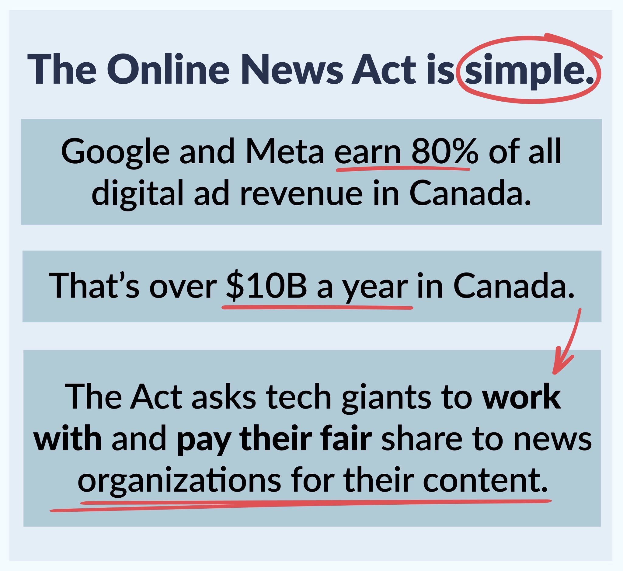 Honestly, I don’t have a lot of suggestions other than to tell the Liberals to stop lying to Canadians, explain the situation they’ve created and back out of Bill C-18 as quickly as possible.