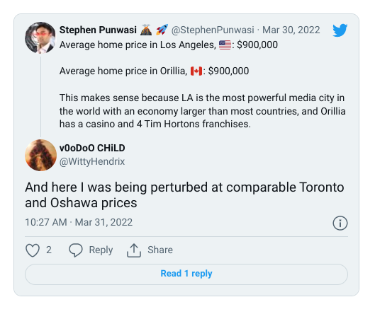 FFS, people are laughing and mocking Canada by comparing house prices in LA to Orillia. The quote being: