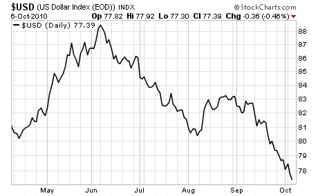 That’s right, this week we overtook Japan, leaving China as the only country with greater ownership of US Debt. And we’re printing money to buy it. Setting aside the fact that this is abject lunacy, this policy is trashing our currency which has fallen 13% since June… as in four months ago. Want an explanation for why stocks, commodities, and Gold are exploding higher? Here it is: