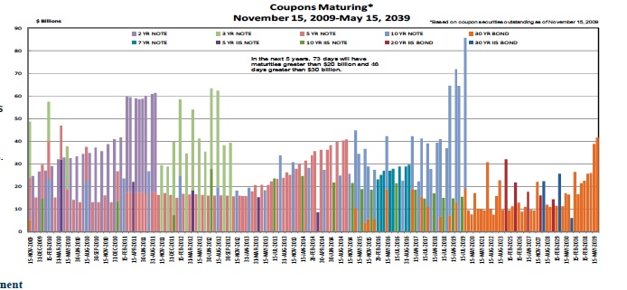So we’re talking about TRILLIONS of old debt coming due in the next decade. The below chart depicting the debt coming due between 2009 and 2039 comes courtesy of the US Treasury itself. In plain terms, we’ve got some much debt that needs to be rolled over that you can’t even fit it on one page and still read it.
